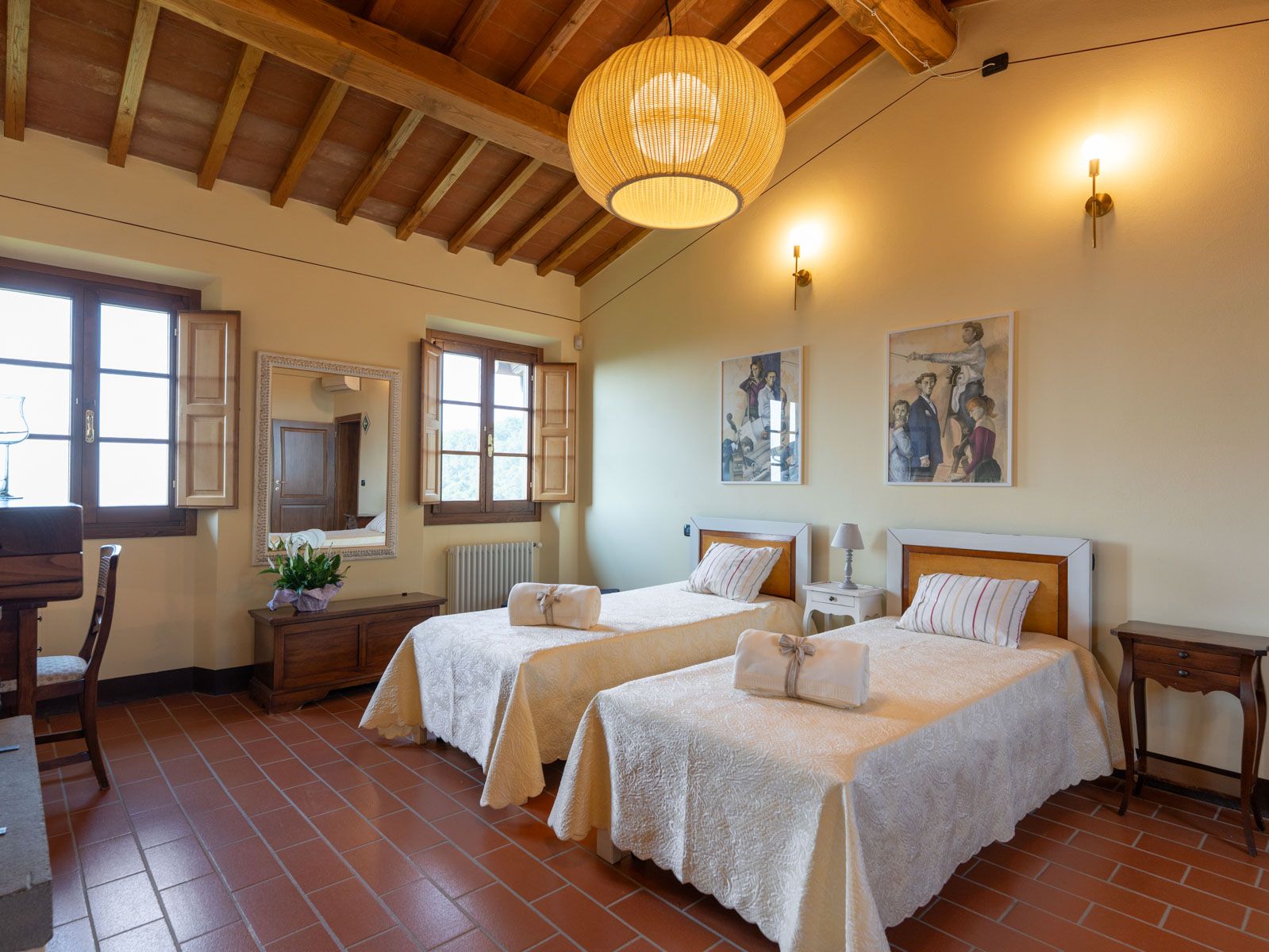 Twin bedroom at the first floor (the twin beds can be converted to a double bed), with fire-place and with the view on the valley and on the garden.
